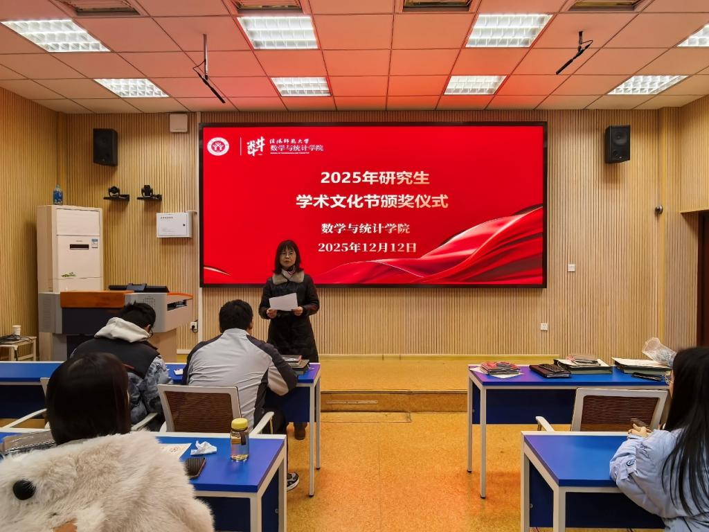 12月12日,数学与统计学院在数学楼507报告厅举办2025年研究生“学术文化节”颁奖仪式。副院长王霞和副处级辅导员谢艳丽参加此次活动。仪式由研究生辅导员王逸卓主持。