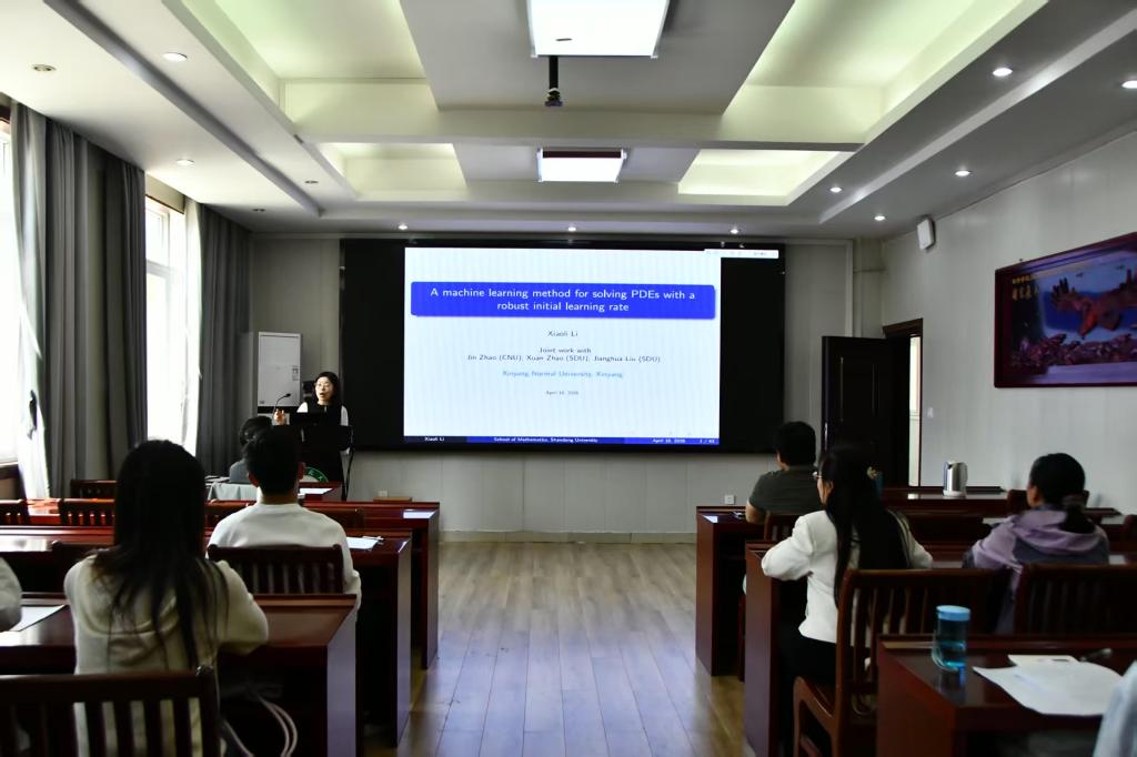 4月18日上午,应数学与统计学院邀请,山东大学李晓丽教授作了题为《A machine learning method for solving PDEs with a robust initial learning rate based on Lagrange multiplier optimization》的学术报告。报告会由李世顺教授主持,部分老师和研究生聆听了此次报告。