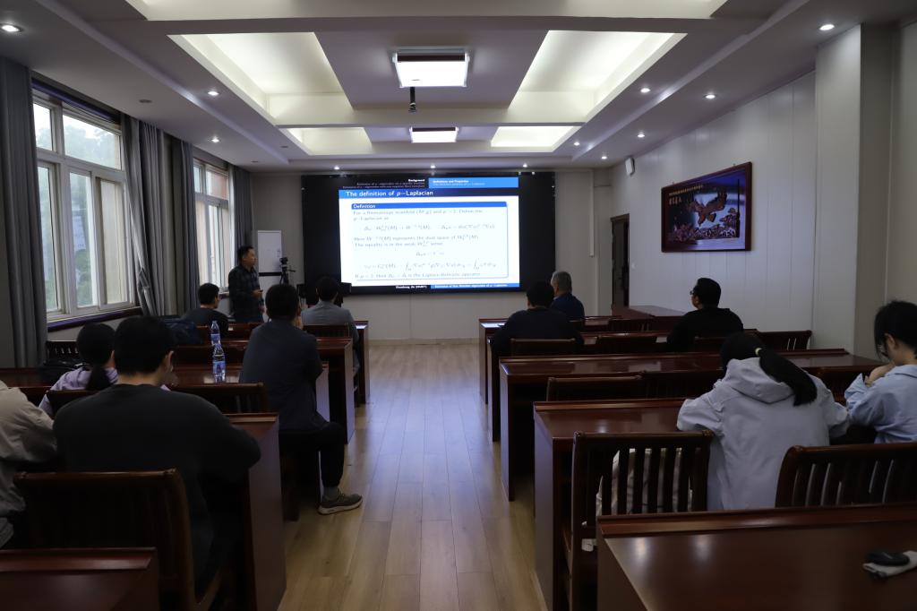 靳晓尚副教授在本次报告中,围绕“黎曼流形中p-拉普拉斯算子的第一狄利克雷特征值估计”这一课题,首先回顾了非负Ricci曲率黎曼流形中经典拉普拉斯算子特征值的研究,进而介绍了p-拉普拉斯算子特征值的研究进展,最后详细讲解了他们在具有负曲率下界的黎曼流形中p-拉普拉斯算子特征值方面取得的成果。