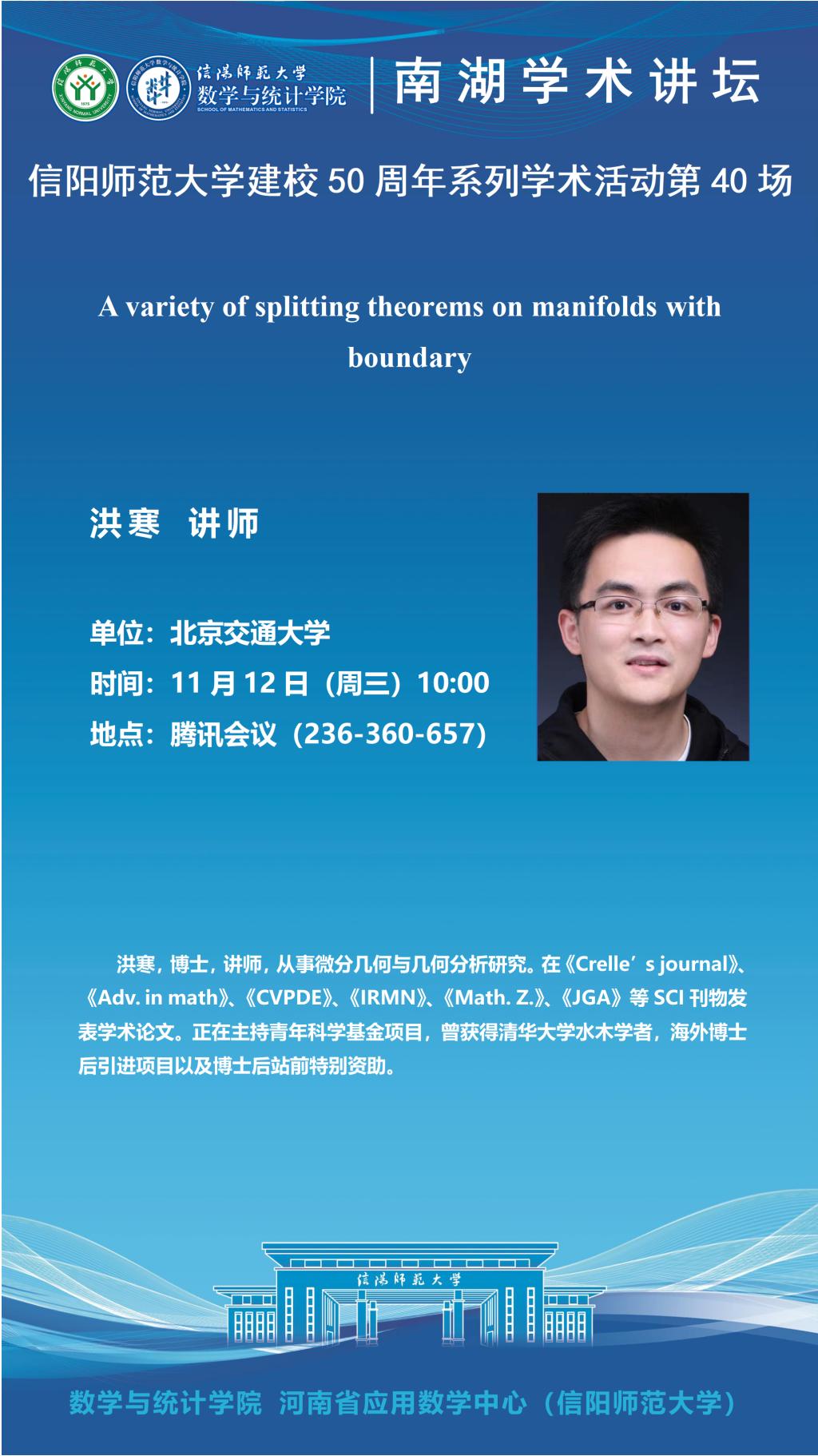 庆建校50周年之南湖讲坛:北京交通大学洪寒讲师——A variety of splitting theorems on manifolds with boundary